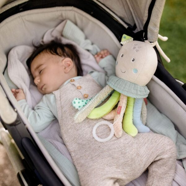 The Musical Octopus is a cuddly toy and sleeping aid for babies from birth, featuring the soothing melody of “Brahm’s Lullaby.” Made from soft materials like velvet, muslin, and plush, it encourages touch and imagination while providing comfort and security. With straps for easy attachment to cots, prams, or play gyms, it’s perfect for home or on the go and makes an ideal gift for baby showers, birthdays, or special occasions.