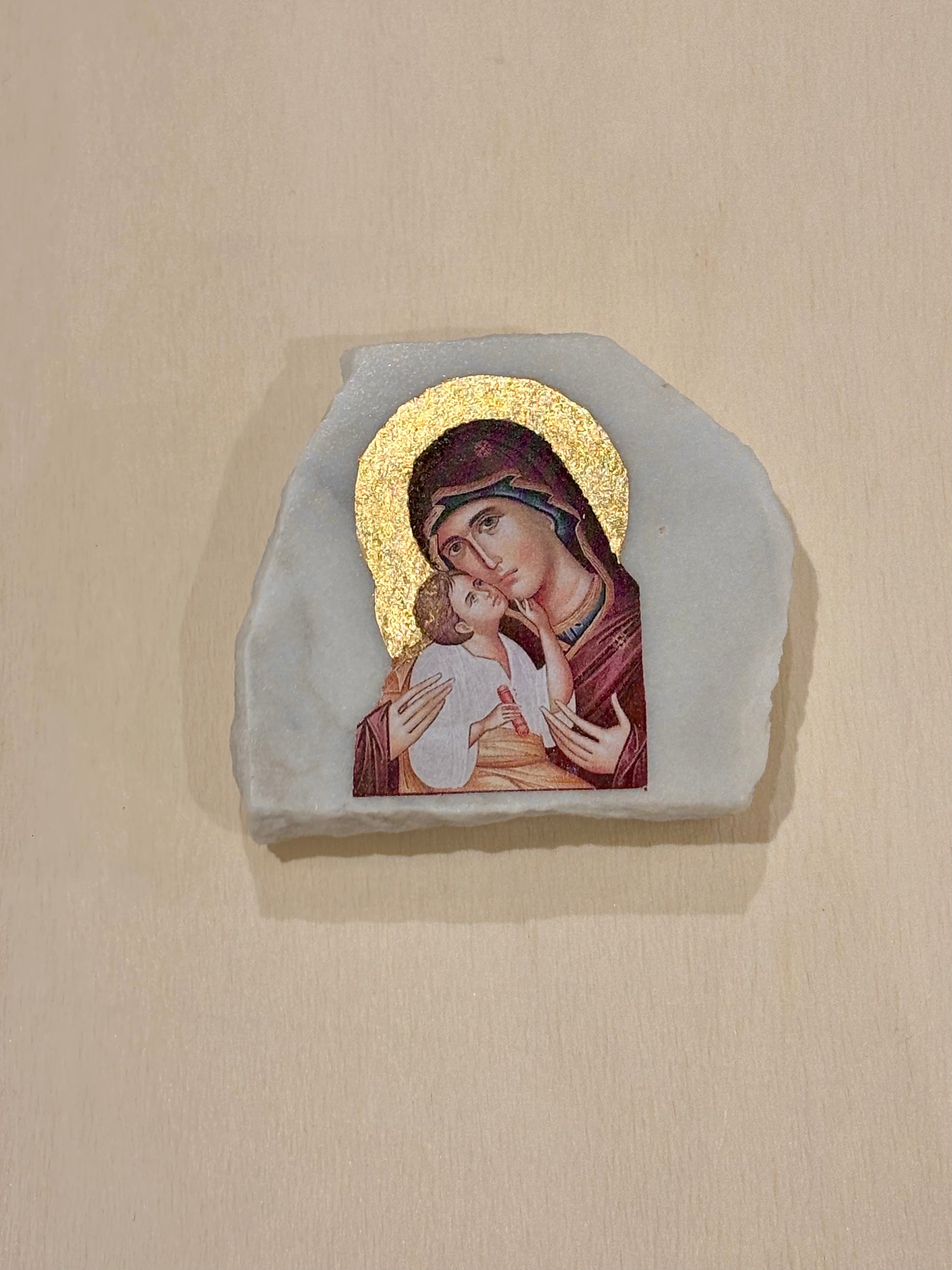 This icon, known as Glykophilousa, depicts the Theotokos lovingly embracing the infant Christ as He tenderly presses His cheek or lips to hers. It captures the profound intimacy and love between mother and child, symbolising both Christ’s true humanity and the deep compassion of the Virgin Mary. This icon is a favourite among the faithful for its warmth, tenderness, and maternal devotion.
